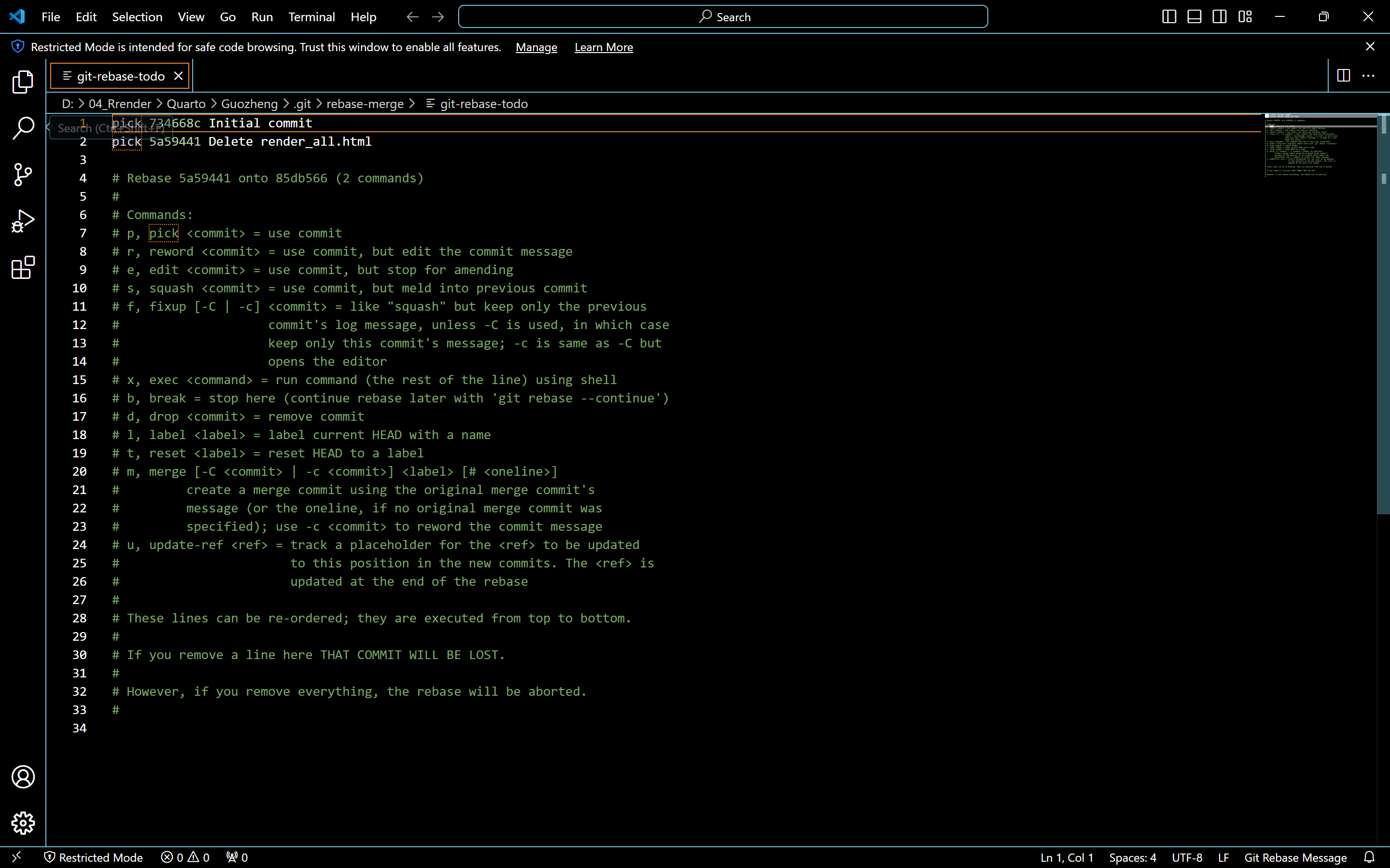 打开的界面,故而只剩下了两个提交记录——可以看到界面中有两行pick。实际上,原来有着数十行pick,现在都被合并到了第一行pick中,即pick 734668c Initial commit