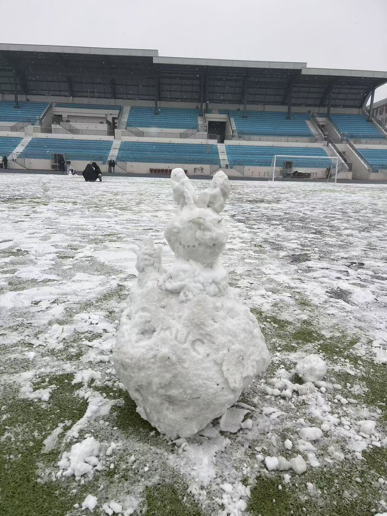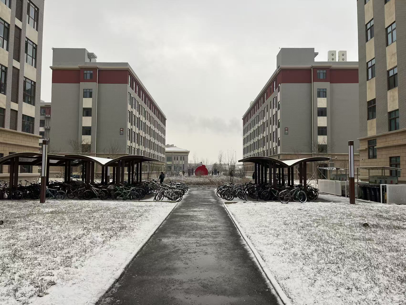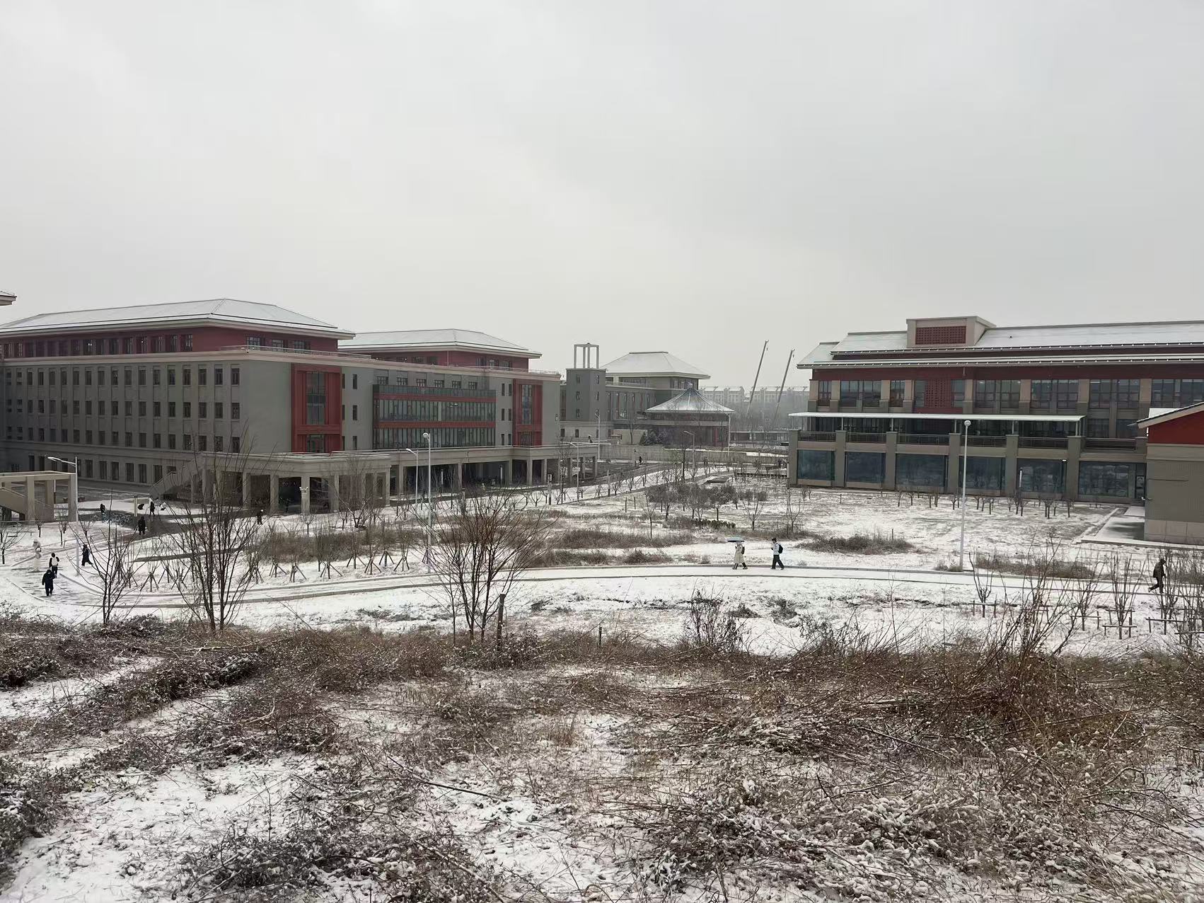 写完字后我来到了操场——果不其然有很多人,大家三三两两站在四处,有的在拍照,有的在玩雪。我和勒哥还有肖哥约好在操场碰面,大家一起玩耍、拍照。是的,我们宿舍只有三个南方人,我来自广东,勒哥来自四川,肖哥来自贵州,见了「大雪」都激动不已,只有在内蒙长大的硕哥来自北方并对此无动于衷。