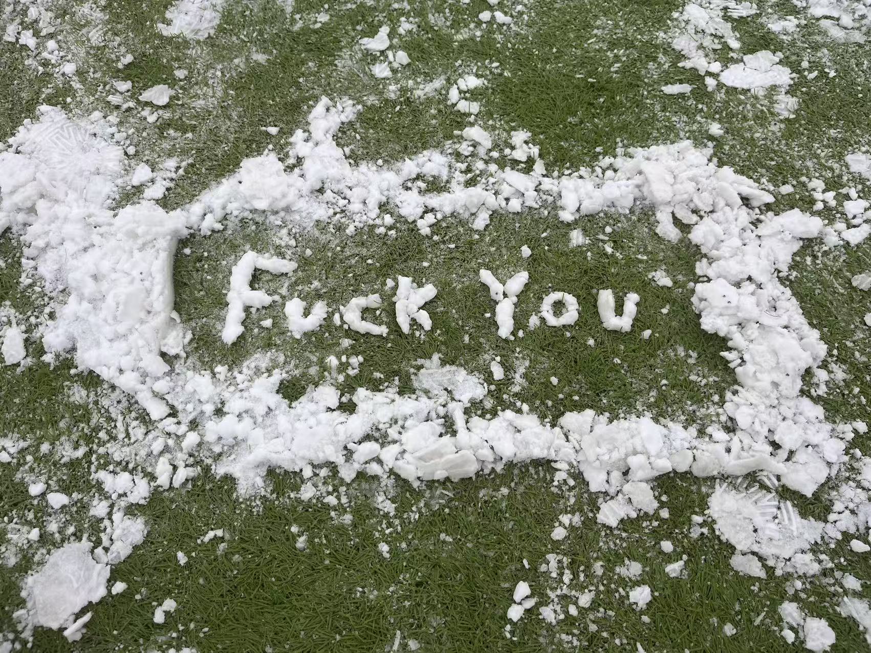 hl 来了以后和一位同学则用雪块拼了一个「Fuck You」。