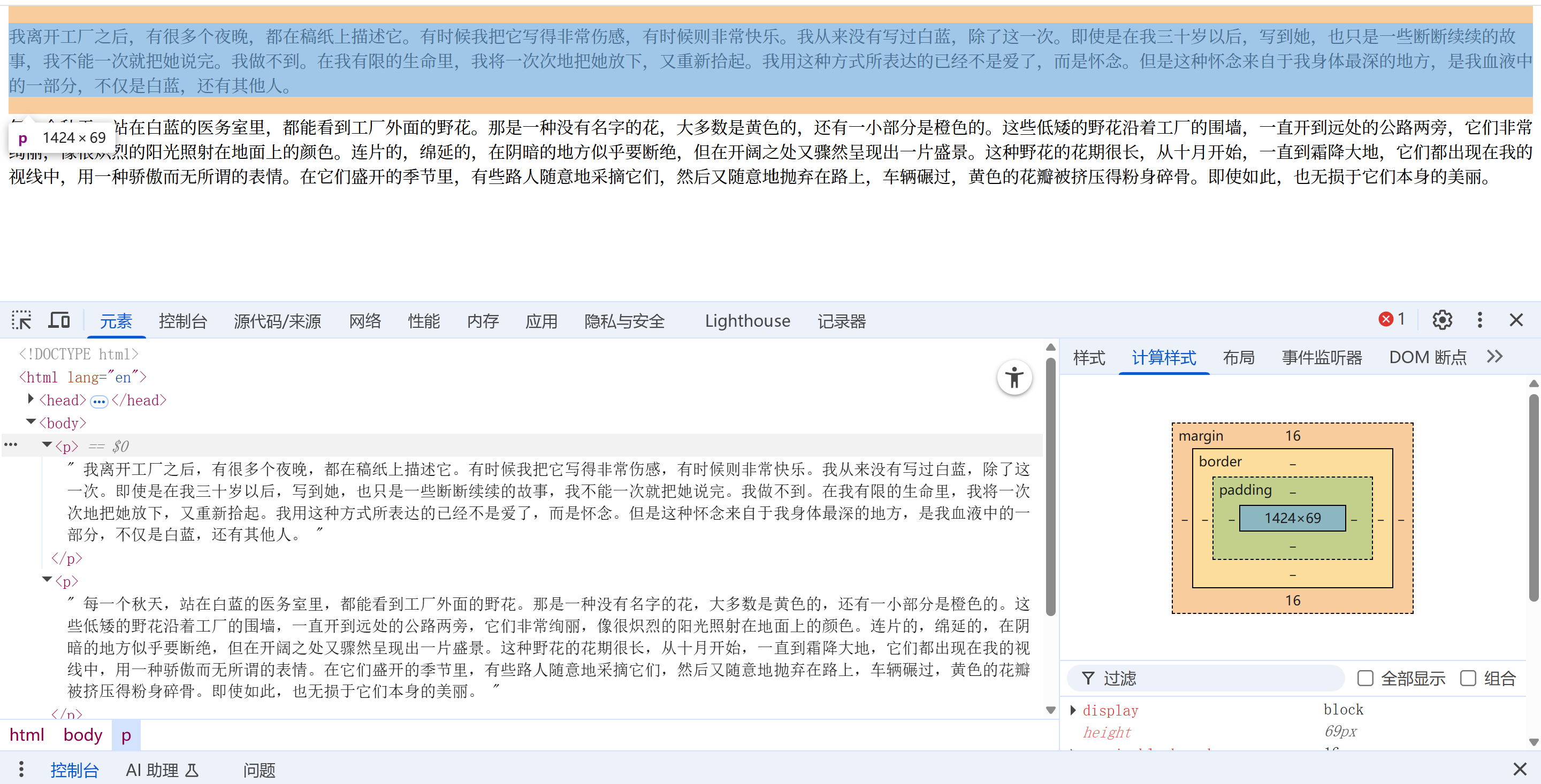 在上面的示例中,两个 p 元素构成的段落之间存在着空隙,在检查中能发现是浏览器给加上了 CSS 样式,上下的 margin 是 16px。值得注意的是,第一段的下方空隙是 16px,第二段的上方空隙也是 16px,但是在检查时都显示为 16px 而非 32px,这是因为两者被合并了。如果不想合并,也可以通过 BFC(块级格式化上下文)阻止相邻的块级元素的垂直 margin 合并。