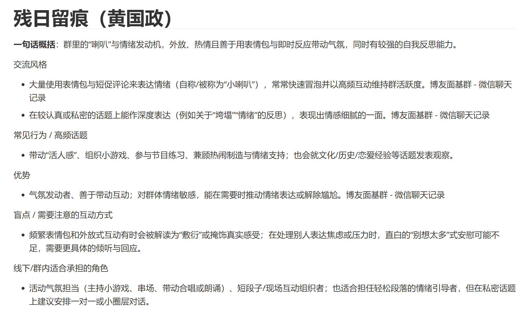 我使用 AI 对这部分聊天记录进行了个人性格与画像的分析,发现 AI 的概括和分析与我的认知基本吻合,甚至能发现一些我忽略的特点。相较而言,AI 对 HTML 的分析应当比对 PDF 的分析效果更好,而 TXT 则可能最好。
