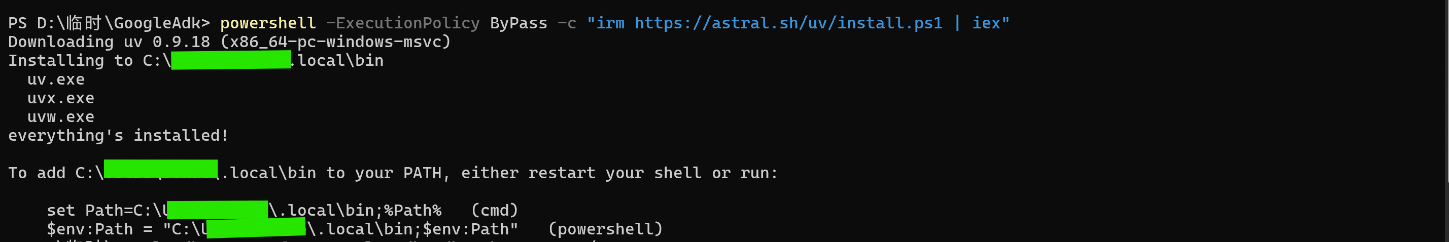 powershell -ExecutionPolicy ByPass -c "irm https://astral.sh/uv/install.ps1 | iex"