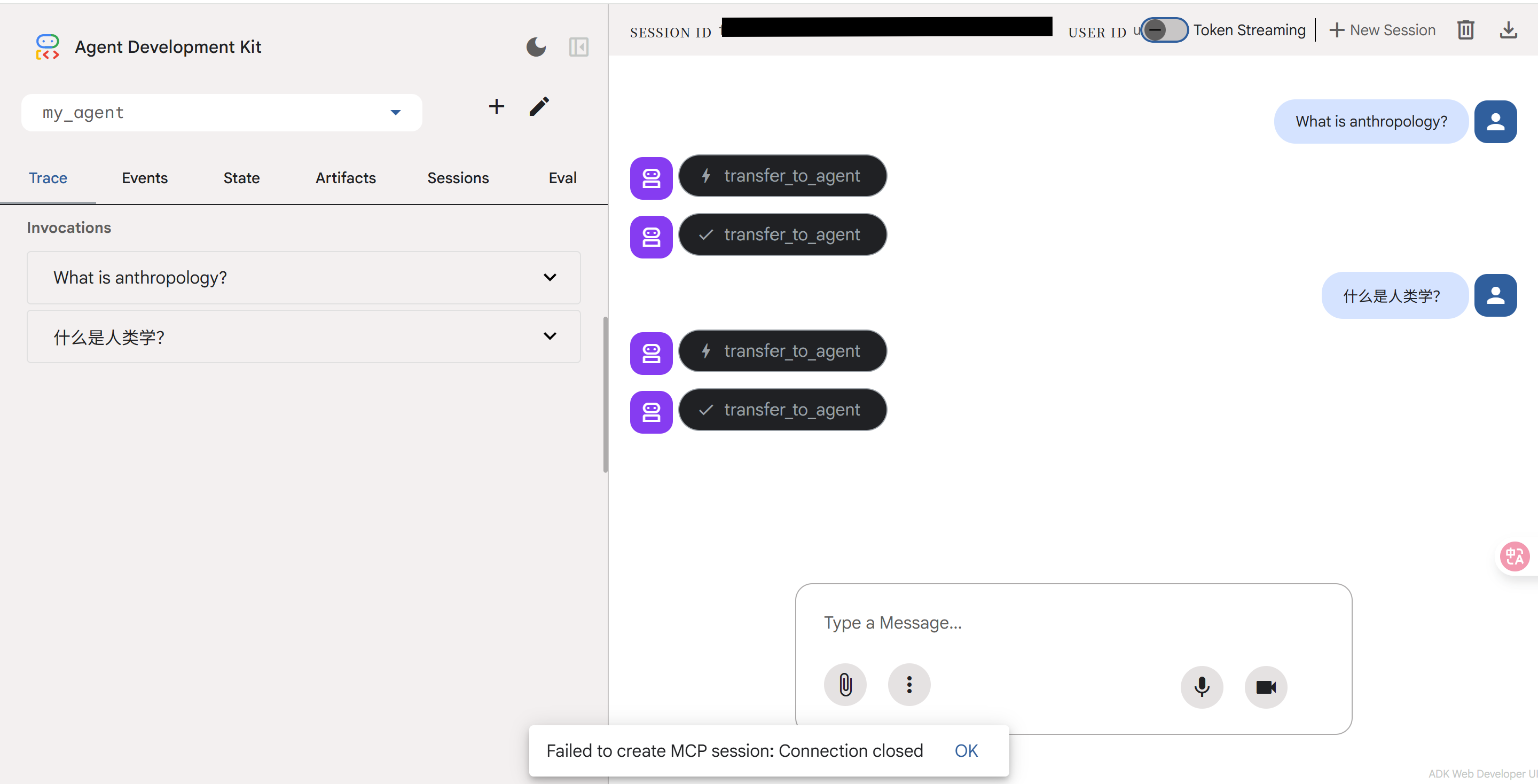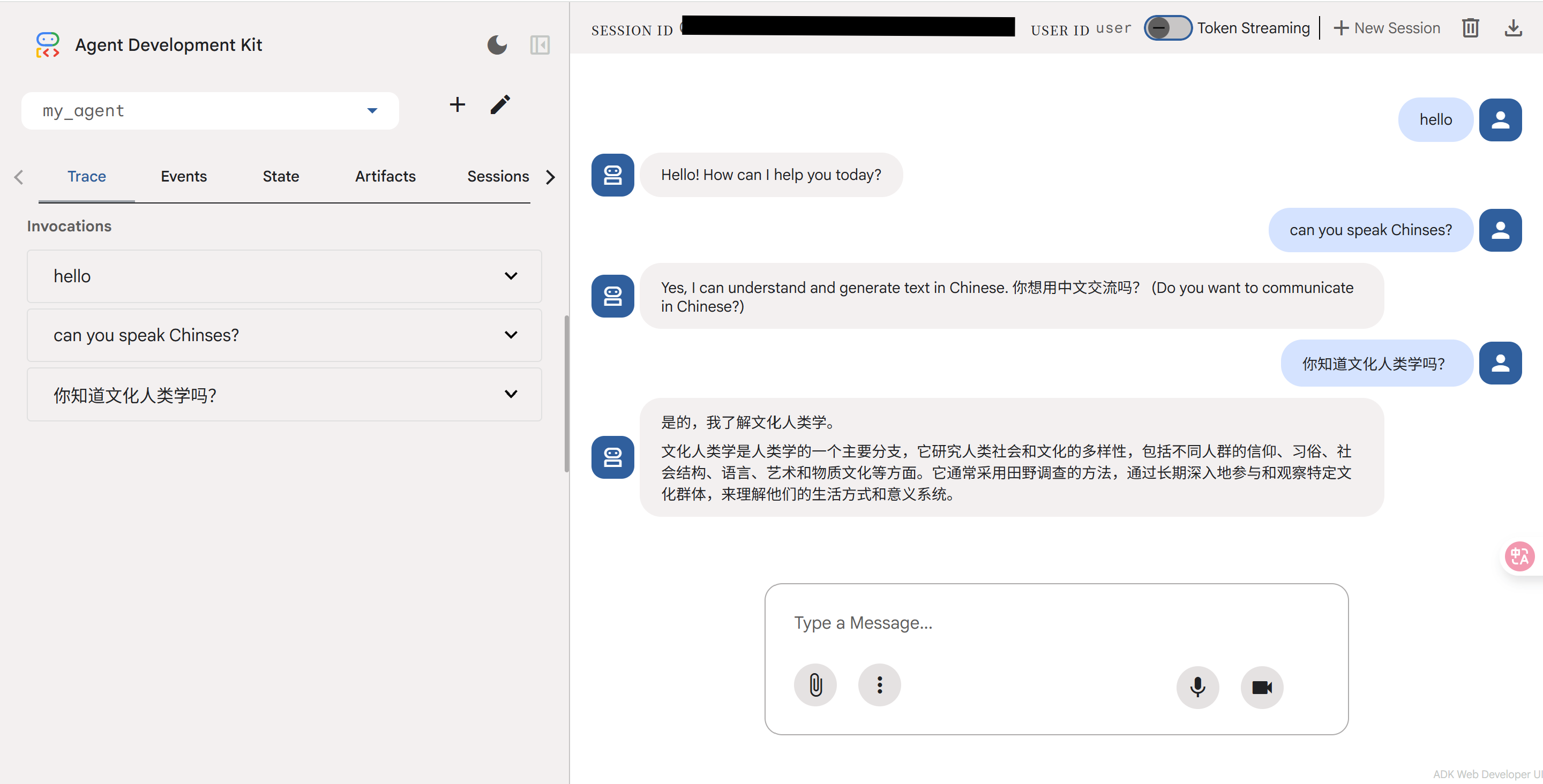 但这次给出的网址中的 Web UI 却完全可以正常运行。我问了 agent 两个问题,一个是「can you speak Chinese」,另一个是「你知道文化人类学吗」,agent 都回答上了。